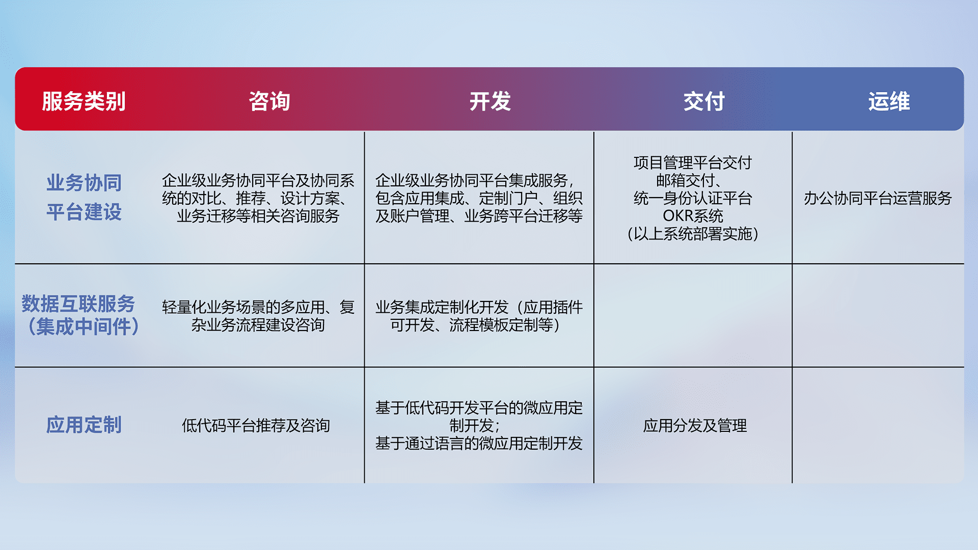 针对钉钉、、、企微、、、、IDaas等平台级产品提供产品的规划、、方案、、、交付、、、定制化开发等服务,,,实现如统一协同办公、、智能客户服务、、、混合会议管理、、、、智能数据查询、、等业务场景,,,,实现数字化转型。。。。